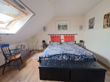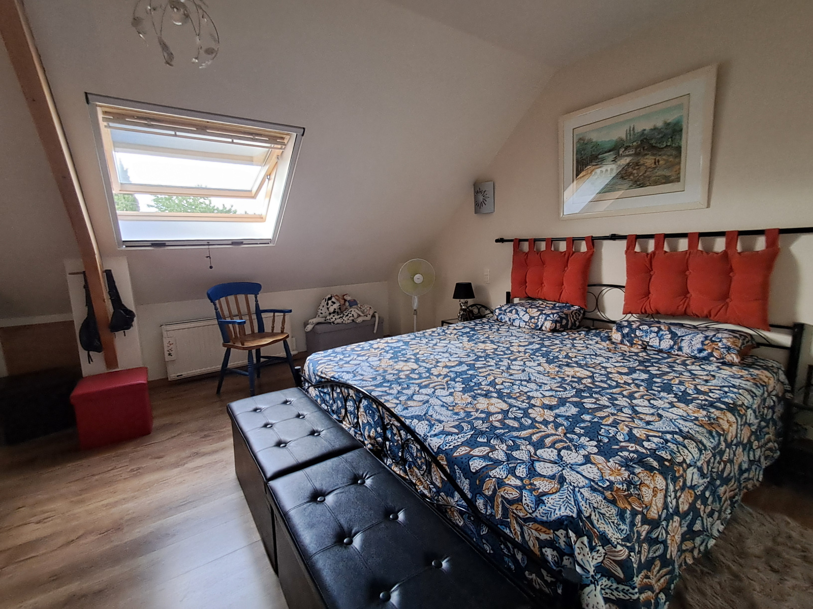 Toujours au rez-de-chaussée, une chambre permet une vie de plain-pied, accompagnée d’une salle de bain et de WC séparés.