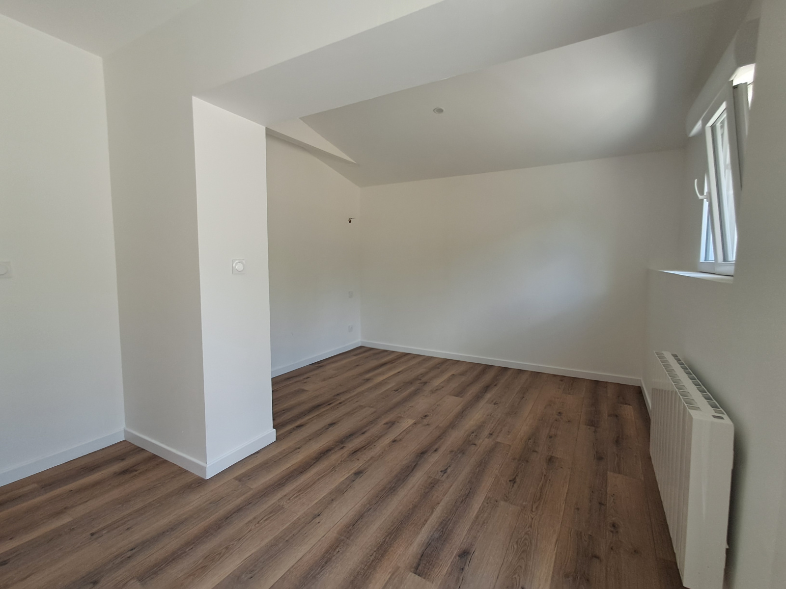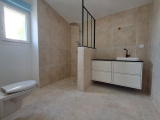 Un couloir dessert une buanderie, une salle d’eau avec douche à l’italienne et WC, ainsi qu’une belle chambre de 17 m² bénéficiant d’une porte-fenêtre ouvrant sur l’extérieur.
