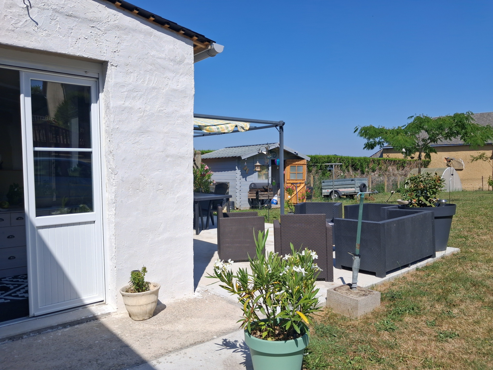 La maison dispose également d’un garage indépendant accessible depuis la maison, parfait pour stationner un véhicule ou entreposer outils et équipements de jardin. Un atelier complète l’ensemble, un vrai plus pour les bricoleurs.