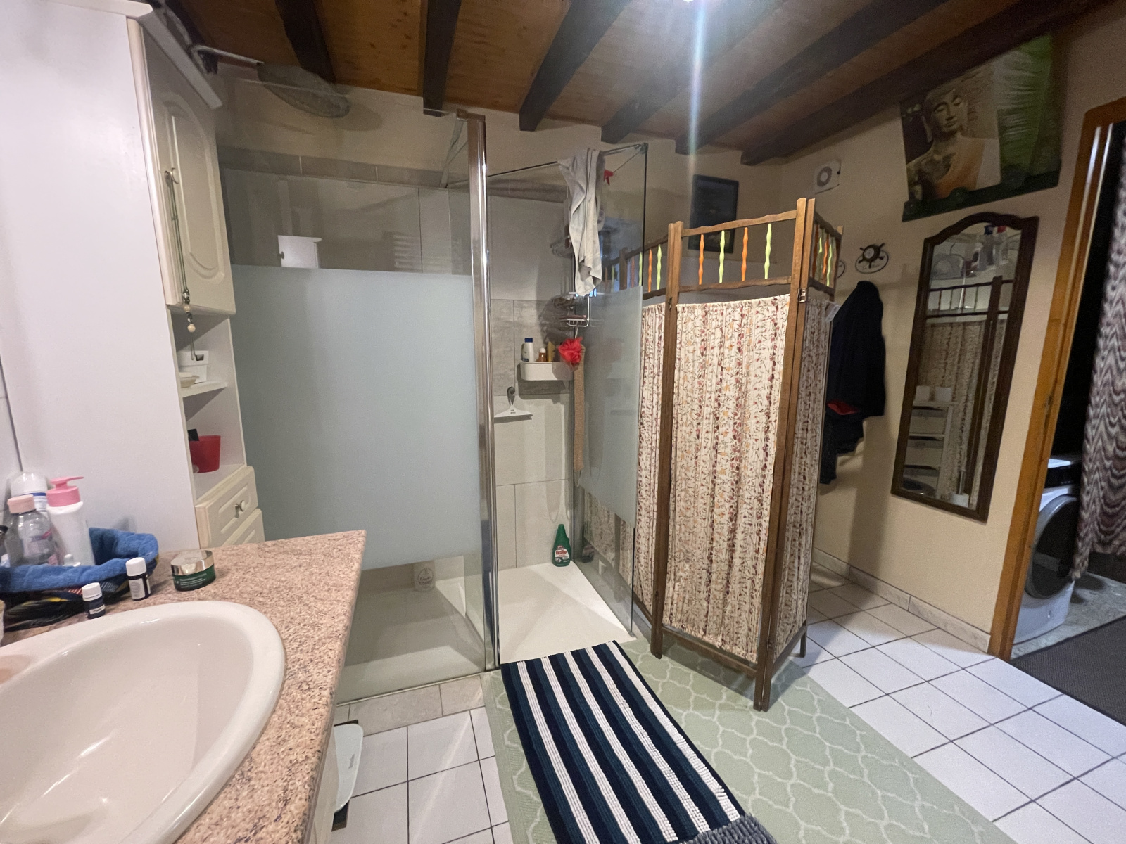 Le rez-de-chaussée comprend également une chambre confortable, idéale pour une vie de plain-pied ou pour accueillir des invités, ainsi qu’une salle d’eau avec douche et toilettes, fonctionnelle et bien agencée.