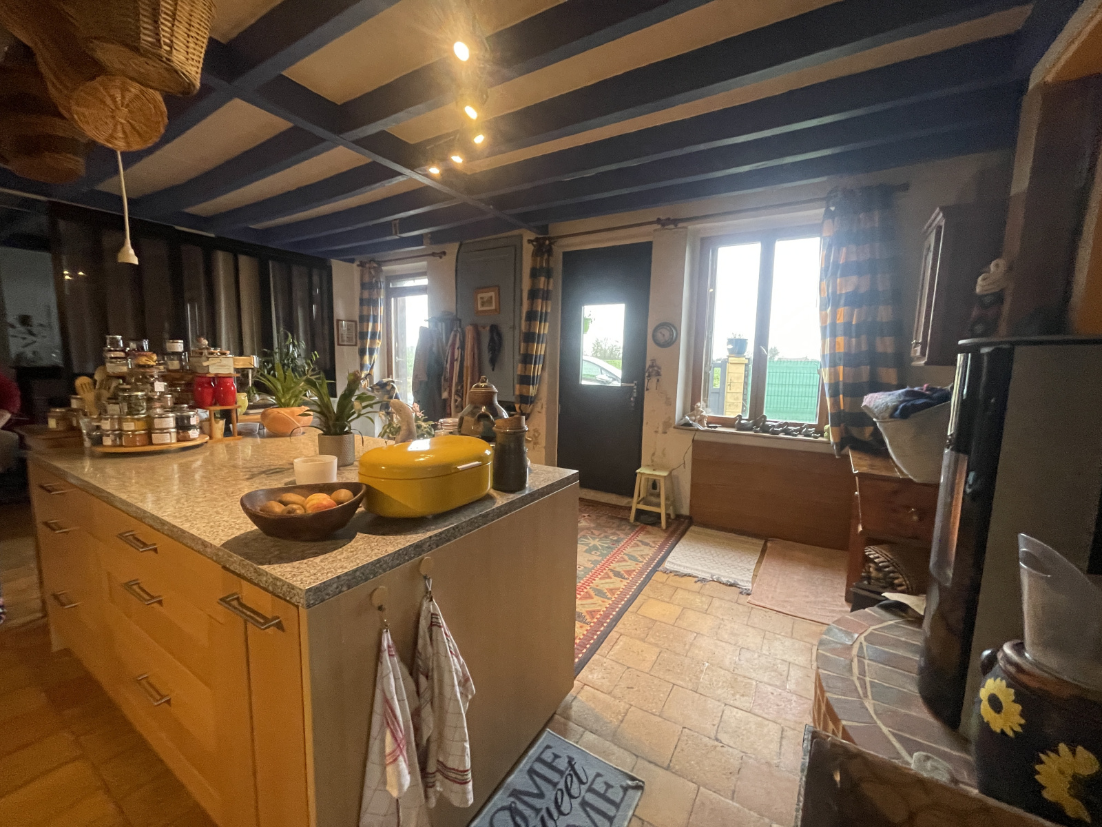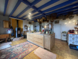 L’entrée s’ouvre sur une cuisine moderne, entièrement aménagée et équipée, pensée pour la convivialité. Son îlot central en fait un espace agréable pour cuisiner et partager des moments en famille ou entre amis. Ouverte sur la pièce de vie, elle bénéficie d’une belle luminosité et d’un agencement fluide. Un poêle à granulés complète cet espace, apportant une chaleur douce et homogène, tout en garantissant une excellente performance énergétique. Les menuiseries en double vitrage renforcent le confort thermique et phonique de l’habitation.