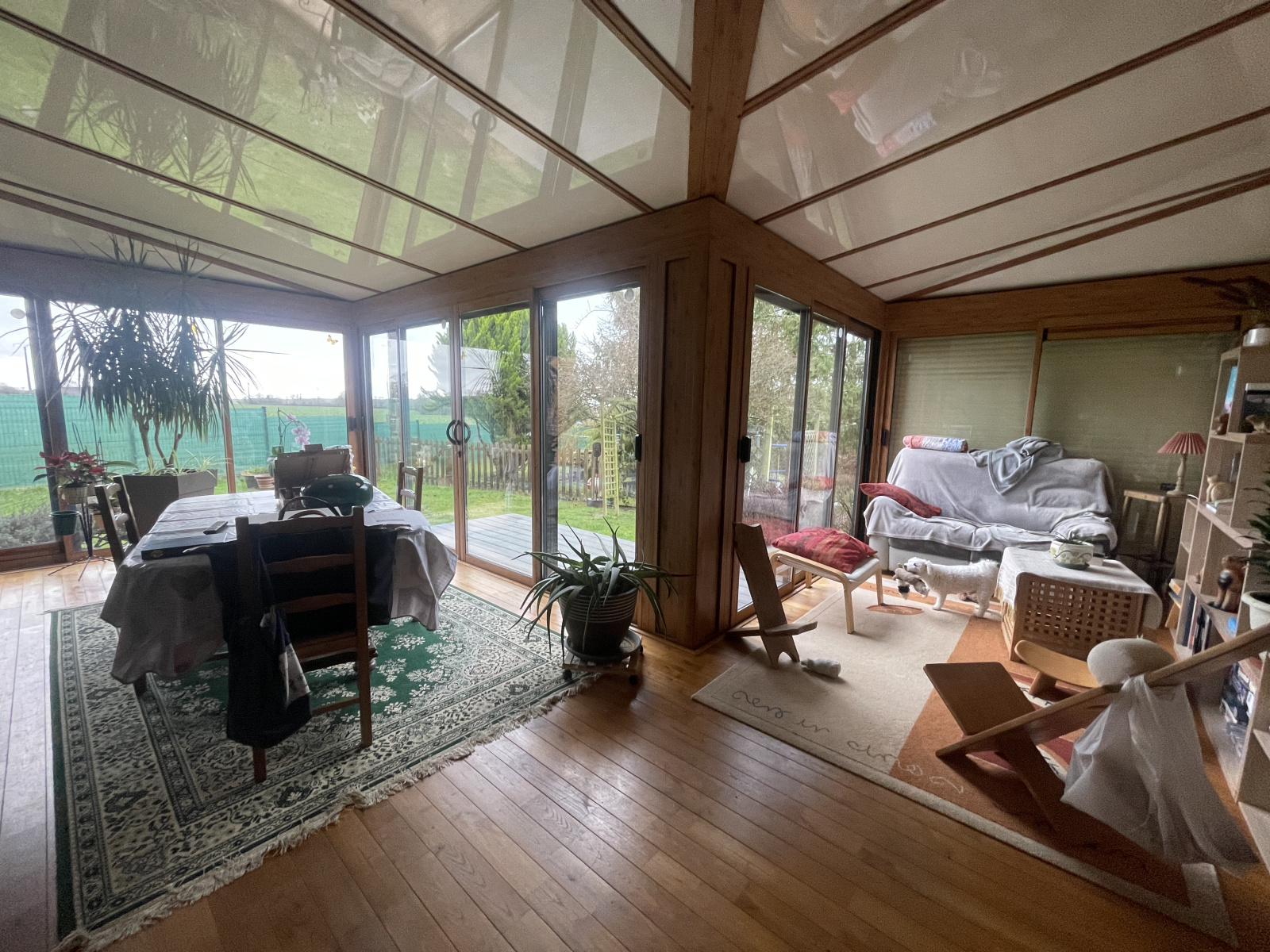 La véranda constitue l’un des véritables atouts de la maison. Spacieuse et lumineuse, elle s’apparente à une pièce de vie à part entière grâce à ses larges baies vitrées donnant sur le jardin. Entièrement équipée de volets électriques et d’une climatisation réversible, elle permet de profiter pleinement de la vue et de la lumière naturelle en toute saison, été comme hiver. Cet espace se prête parfaitement à un salon, une salle à manger ou un lieu de détente.
