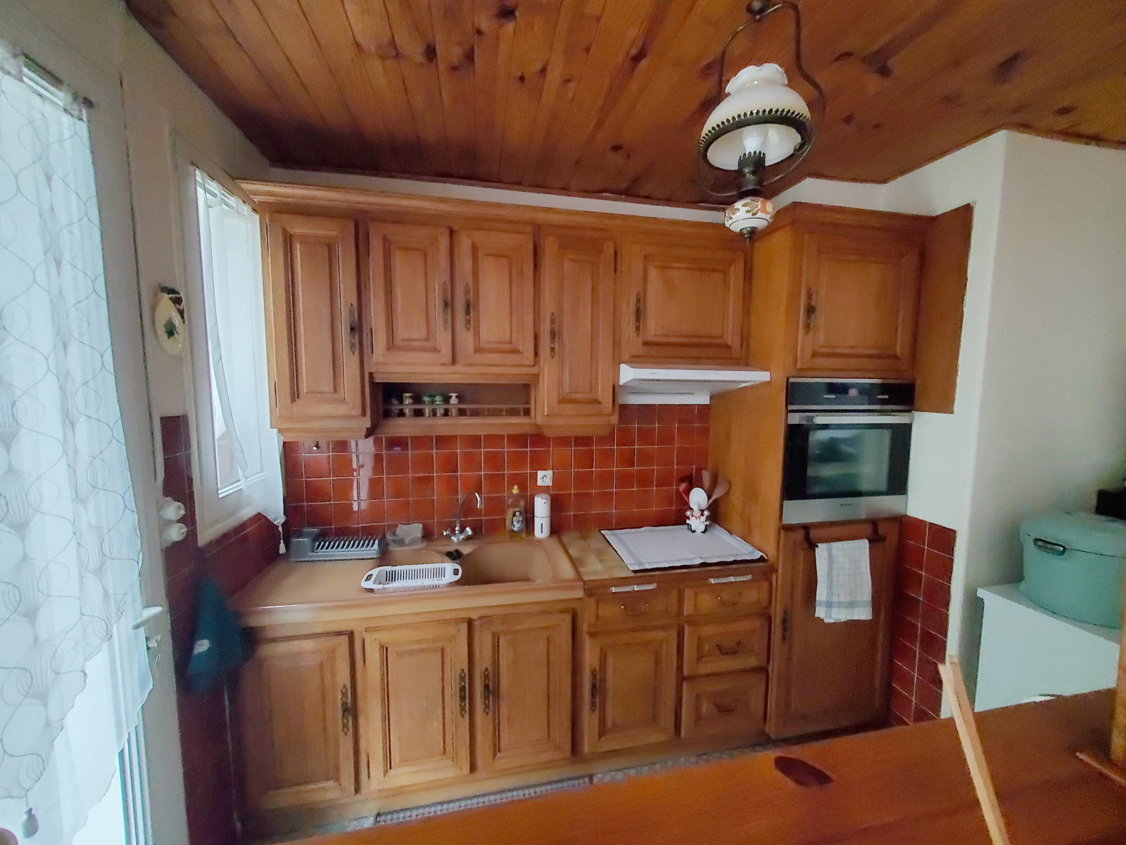 Au rez-de-chaussée, vous découvrirez un salon/séjour avec cheminée insert, ainsi qu'une cuisine ouverte, aménagée et équipée. Accès depuis la cuisine à la terrasse.